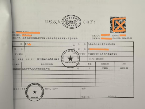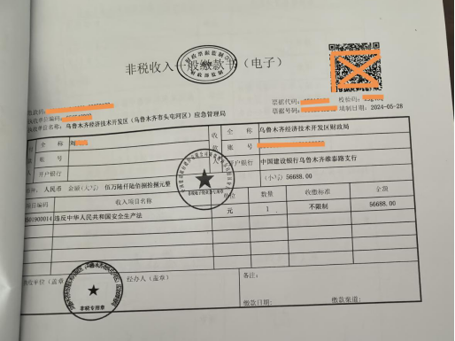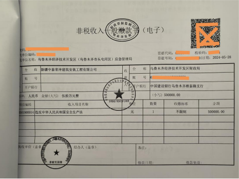 1.新疆中泰榮坤建筑安裝工程有限公司,區(qū)應(yīng)急管理局已經(jīng)對(duì)新疆中泰榮坤建筑安裝工程有限公司處以50萬元罰款的行政處罰。新疆中泰榮坤建筑安裝工程有限公司已繳納罰款。