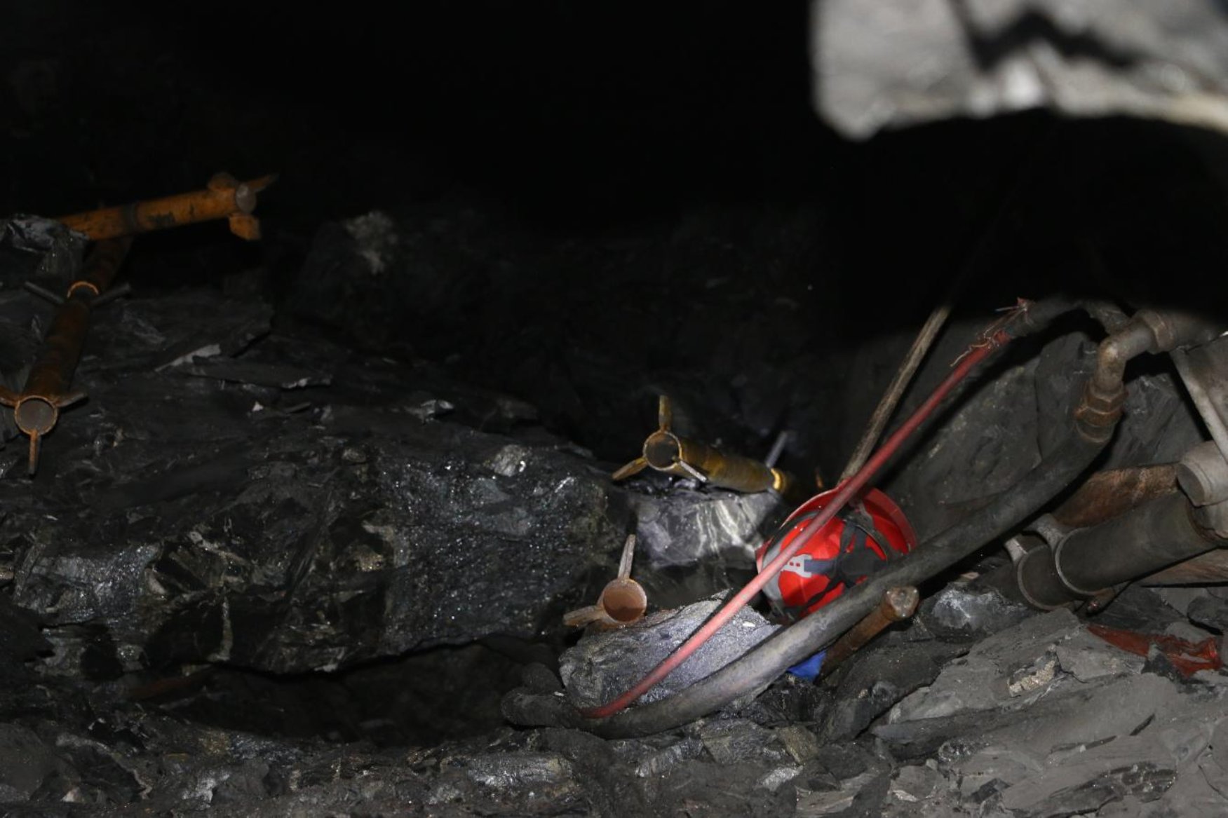 圖2:中心現(xiàn)場細目(冒落的塊狀礦石、被壓的管線支柱及安全帽等)