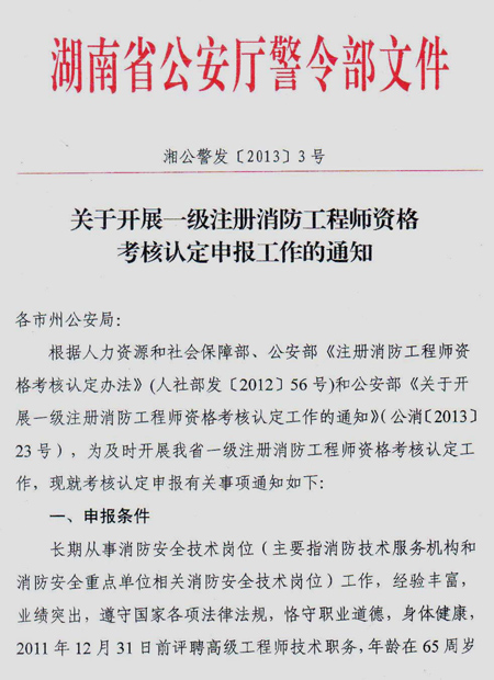 (一)各級公安機關(guān)及相關(guān)單位應(yīng)當抓緊對本地區(qū)、本單位、本企業(yè)有關(guān)一級注冊消防工程師考核認定申報工作進行部署,加強宣傳,確保廣大從事消防安全技術(shù)工作的專業(yè)技術(shù)人員及時知曉,按要求申報。