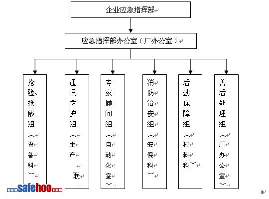(2)成立事故應(yīng)急總指揮部??傊笓]由廠長擔任,如有特殊情況廠長不能到位時,由生產(chǎn)副廠長代任。副總指揮由生產(chǎn)副廠長和設(shè)備副廠長擔任。成員由生產(chǎn)科、保衛(wèi)科、設(shè)備科、技術(shù)科、材料科以及各車間負責人組成。(只能出現(xiàn)職位)