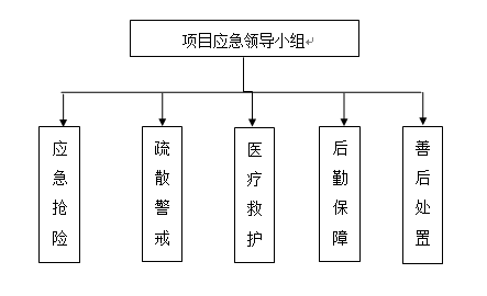 應(yīng)急領(lǐng)導(dǎo)小組下設(shè)應(yīng)急搶險(xiǎn)組、疏散警戒組、醫(yī)療救護(hù)組、后勤保障組、善后處置組等應(yīng)急執(zhí)行小組。