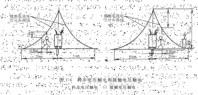 雷電流入地或電力線(特別是高壓線)斷散到地時,會在導(dǎo)線接地點(diǎn)及周圍形成強(qiáng)電場。當(dāng)人畜跨進(jìn)這個區(qū)域,兩腳之間出現(xiàn)的電位差稱為跨步電壓Ust。在這種電壓作用下,電流從接觸高電位的腳流進(jìn),從接觸低電位的腳流出,從而形成觸電,如圖1-6a所示。跨步電壓的大小取決于人體站立點(diǎn)與接地點(diǎn)的距離,距離越小,其跨步電壓越大。當(dāng)距離超過20m(理論上為無窮遠(yuǎn)處),可認(rèn)為跨步電壓為零,不會發(fā)生觸電危險。