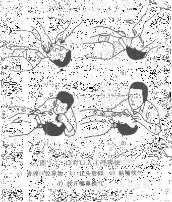 3)救護者站在觸電者的一邊,一只手捏緊觸電者的鼻子,一只手托在觸電