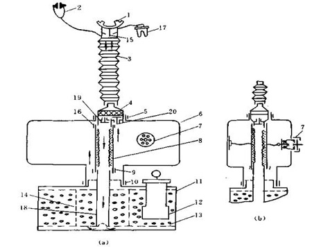 AZH-40型化學(xué)氧自救器的結(jié)構(gòu)原理如圖13-2-4所示。人的呼氣從口具1經(jīng)呼吸軟管3、帶降溫器的閥盒4、呼氣閥19、呼氣管8、藥罐中心管18、再從藥罐11的底部返上來,經(jīng)過藥罐中的生氧劑13(藥片狀或粒狀超氧化鉀),將呼氣中的水汽及C02吸收掉并放出O2,富氧的空氣再進入氣囊6以供吸氣時使用。吸氣時,富氧空氣經(jīng)吸氣閥20、閥盒4、呼吸軟管3、口具1而吸入人的肺部。當(dāng)生氧量超過人的呼吸需要時,氣囊因積聚過多氣體而膨脹,設(shè)在氣囊上的拉繩遂將排氣閥7拉開,見圖中(b),氣囊中過剩的氣體即從排氣閥排泄到外界大氣中去。