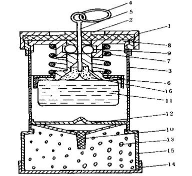 啟動裝置(圖13-2-4中12)是為了自救器在使用一開始即能產(chǎn)生氧氣而設(shè)置的,其結(jié)構(gòu)見圖13-2-5。當(dāng)打開自救器后,拉動拉環(huán)4,啟動針5被拉出,滾珠9在彈簧作用下向中心滾動,沖擊座6失去卡緊力在彈簧7的作用下向下沖擊,使硫酸瓶11直接與撞針孔板12相撞,在尖凸部分作用下被擊破,其中酸液流出,經(jīng)孔板上的小孔、引導(dǎo)漏斗10流入藥劑筒15內(nèi),與其中的NaO2啟動生氧藥劑相互作用產(chǎn)生出氧氣(在30s內(nèi)可生氧2升以上),溢出到生氧藥罐中,繼而進入氣囊。使用時,當(dāng)甩掉自救器外殼后,氣囊應(yīng)逐漸自動充氣鼓起,藥劑筒壁變熱,這表明自救器已正常起動。如一旦氣囊未鼓起,則應(yīng)立即采取用嘴從口具向氣囊內(nèi)吹氣,吹鼓后再戴好口具、鼻夾,先緩步撤退,待生氧劑放氧充足后再加快行走步伐。