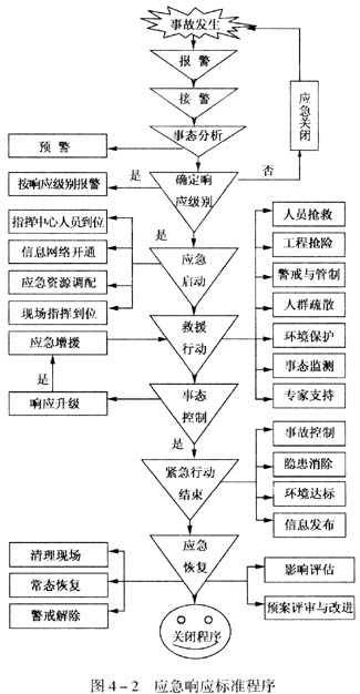 應(yīng)急響應(yīng)程序的具體操作一般按照下列標準程序進行即:報警、接警、事態(tài)分析、確定相應(yīng)級別、預(yù)警、應(yīng)急劇動、救援行動、擴大應(yīng)急、應(yīng)急結(jié)束、應(yīng)急恢復等過程。如圖4-2所示。