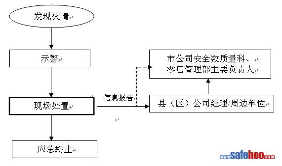 處置結(jié)果判斷:火情消除,現(xiàn)場(chǎng)得到控制,做好善后工作,應(yīng)急結(jié)束。如果事故危害程度、影響范圍已超出或即將超出本站控制能力時(shí),請(qǐng)求增援,擴(kuò)大響應(yīng)。