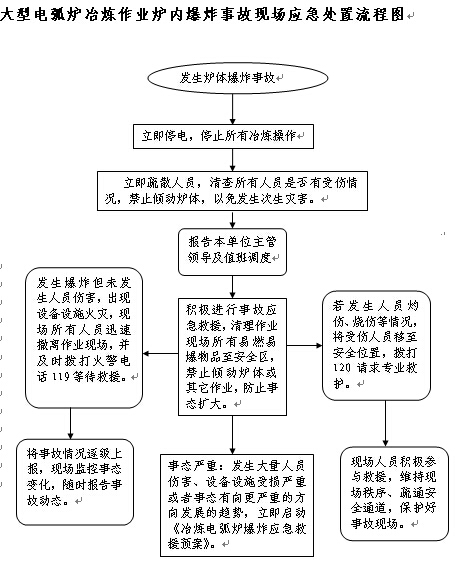 | 應(yīng)急處置 | 處置程序: 1.發(fā)生冶煉爐內(nèi)氣氛異常或電弧聲音異常,應(yīng)立即停電檢查。 2.若發(fā)生水冷件漏水較大時(shí),嚴(yán)禁傾動爐體,立即疏散人員。 3.平時(shí)加強(qiáng)巡檢,發(fā)現(xiàn)爐殼發(fā)紅時(shí)應(yīng)及時(shí)停電處理,當(dāng)發(fā)紅位置在爐前或爐后位置時(shí),爐體向反向位置傾動,使發(fā)紅位置脫離鋼液面。當(dāng)發(fā)紅位置在爐體兩側(cè)時(shí),應(yīng)及時(shí)向渣道內(nèi)傾倒鋼水,以防爐體漏鋼燒壞設(shè)備而引起較大的事故。 4.發(fā)生爆炸造成火災(zāi)事故,但無人員傷亡的情況下,及時(shí)撥打119等待專業(yè)消防救援。 5.在發(fā)生人員傷害的情況下,及時(shí)將傷員移至安全位置,同時(shí)撥通120等待專業(yè)救護(hù)。 6.逐級上報(bào),啟動《電弧爐爆炸應(yīng)急救援預(yù)案》。 7.現(xiàn)場人員積極參與救援,維持現(xiàn)場秩序、疏通安全通道,保護(hù)好事故現(xiàn)場。 |