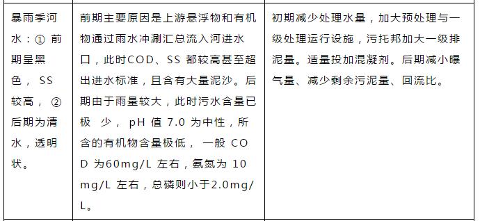 (1)暴雨期下雨量增多;(2)節(jié)假日有可能出現(xiàn)用水量增多或減少情況;(3)現(xiàn)場監(jiān)測出現(xiàn)進水水質(zhì)逐漸增高的情況;(4)進水在線監(jiān)測系統(tǒng)出現(xiàn)COD、氨氮和 PH 超標(biāo)。