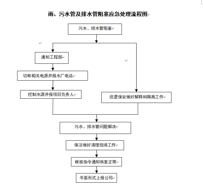 1. 員工發(fā)現(xiàn)樓內(nèi)外有雨、污水管及排水管網(wǎng)阻塞造成溢水現(xiàn)象時,應(yīng)10分鐘通知工程部。