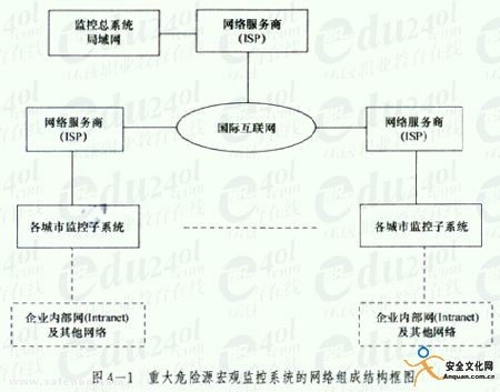 重大危險(xiǎn)源宏觀監(jiān)控系統(tǒng)的網(wǎng)絡(luò)組成結(jié)構(gòu)框圖如圖4—1所示。