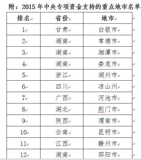 通過(guò)初步審查和現(xiàn)場(chǎng)競(jìng)爭(zhēng)評(píng)審,考察了申報(bào)區(qū)域污染治理的緊迫性、方案的合理性、基礎(chǔ)工作條件、保障措施等,財(cái)政部、環(huán)境保護(hù)部確定對(duì)綜合排名前30位的地市(下轄38個(gè)重點(diǎn)區(qū)域)予以支持。支持名單于6月1-5日在財(cái)政部網(wǎng)站上進(jìn)行了公示。中央資金將連續(xù)三年對(duì)重點(diǎn)區(qū)域進(jìn)行支持,其中2015年下達(dá)資金279315萬(wàn)元,用于加快推進(jìn)重金屬污染綜合防治。同時(shí),根據(jù)2014年度《規(guī)劃》實(shí)施考核結(jié)果,對(duì)存在突出問(wèn)題的地市,資金安排按一定比例予以扣減。
