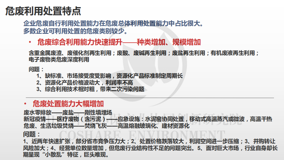 危險廢物利用處置問題日益得到國家、企業(yè)及社會公眾的廣泛關注,在與企業(yè)交流、調(diào)研及現(xiàn)有政策梳理的基礎上,本文作者介紹了目前產(chǎn)業(yè)結構調(diào)整、工藝升級改造帶來的產(chǎn)廢特點變化,分析了我國危險廢物利用處置方式特點,提出危廢利用處置行業(yè)面臨的風險與問題,最后對危險廢物利用處置模式可能的趨勢進行思考與分析。