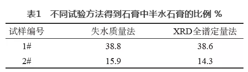 關(guān)于溫度對(duì)石膏脫水比例的影響,通常以石膏的失水質(zhì)量轉(zhuǎn)換為半水石膏的比例,筆者對(duì)比過使用失重法和XRD全譜衍射擬合法定量石膏中半水石膏含量的差別,結(jié)果見表1,結(jié)果表明兩種測(cè)試方法較接近,均可準(zhǔn)確得出石膏中因失水而轉(zhuǎn)換的半水石膏的比例。