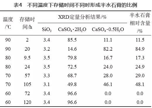 表4 不同溫度下存儲(chǔ)時(shí)間不同時(shí)形成半水石膏的比例