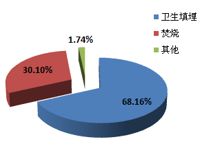 目前,我國城市生活垃圾無害化處理方式包括:衛(wèi)生填埋、高溫堆肥和焚燒,圖1為2014年我國垃圾處理方式比例,顯示我國仍然以填埋為主[2]。但焚燒憑借其減量效果最明顯、無害化最徹底、且焚燒熱量可以有效利用的特點(diǎn),近年來比例上升很快,可以預(yù)見,焚燒正逐步成為處理城市垃圾的最主要方式。