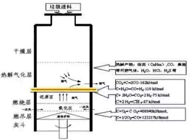 垃圾從上部進(jìn)入脫氧室,保證熱解燃?xì)獠缓鯕?,同時(shí)預(yù)熱;點(diǎn)火時(shí)使用木炭,助燃時(shí)使用熱解氣;焦油裂解氣直接輸入氧化層,保證焦油中的芳香烴燃燒完全; ?熱解供氧量為總需氧量的30%,保證缺氧燃燒,上部熱解氣化層不含氧,不易生成氮氧化物和二噁英。