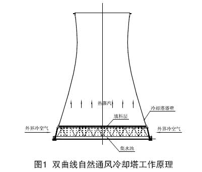 2005年杭州華電半山發(fā)電有限公司因廠區(qū)噪聲嚴重擾民而被國家環(huán)境保護總局強迫停機整頓。為此華電半山發(fā)電有限公司委托有關(guān)單位對該公司廠區(qū)進行了噪聲綜合治理。本文對華電半山發(fā)電有限公司3×390MW燃氣機組配套的2臺冷卻塔的噪聲治理情況予以介紹。 發(fā)電廠的大型冷卻塔一般都是自然通風逆流式冷卻塔,這種冷卻塔的設(shè)計通常采用雙曲線型,塔體由鋼筋混凝土澆制而成,塔筒底部為進風口,用人字型柱、方柱或T型柱交叉支撐,是發(fā)電廠閉式循環(huán)冷卻水系統(tǒng)的關(guān)鍵設(shè)備之一。 發(fā)電廠汽輪發(fā)電機組凝汽器的出水經(jīng)過循環(huán)水泵輸送至冷卻塔的中央豎井,再經(jīng)過配水系統(tǒng)和噴濺裝置均勻分配到填料層,通過填料層后的水流大多變成了均勻分布的連續(xù)的滴狀,最后落入集水池并排出。與此同時,外界的冷空氣由進風口進入冷卻塔,冷空氣在冷卻塔的進風口和出口之間的壓差、內(nèi)外溫差以及冷卻塔因特有的形狀而產(chǎn)生的壓差三者的抽力作用下,在上升過程中與下落的水滴直接進行熱和質(zhì)的交換,熱水的一部分熱能被冷空氣帶走,同時一部分熱水蒸發(fā)成蒸汽而隨空氣一同排出,熱交換和質(zhì)交換的最終結(jié)果是熱水的溫度下降,經(jīng)過循環(huán)再次進入凝汽器。雙曲線自然通風冷卻塔工作原理見圖1。 2 冷卻塔淋水噪聲產(chǎn)生機理及特性