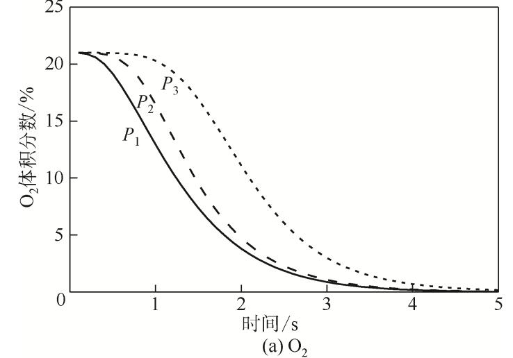 包扎完成后,充入N2前,包袋內(nèi)初始狀態(tài)為空氣,O2和N2的體積分?jǐn)?shù)分別占21%和79%,VOCs為0。假設(shè)包扎密封好,不存在空氣進(jìn)入袋內(nèi)的情況,氧氣則為完全滅失氣體,如圖4(a)所示。其濃度在各個(gè)點(diǎn)位逐次被氮?dú)獯祾叱?,濃度緩慢降低,各個(gè)點(diǎn)位的濃度最終逐步衰減為0。P1~P3在包袋內(nèi)從上游到下游逐次分布,O2滅失也是依此順序逐步衰減。