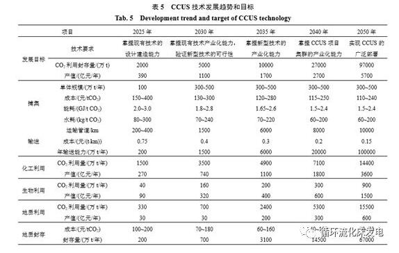 CCUS作為一項有望實現(xiàn)化石能源大規(guī)模低碳利用的技術(shù),是我國未來減少CO2排放、保障能源安全和實現(xiàn)可持續(xù)發(fā)展的重要手段。隨著示范項目范圍擴大,未來有望建成低成本、低能耗、安全可靠的CCUS技術(shù)體系和產(chǎn)業(yè)集群,為化石能源低碳利用提供技術(shù)選擇,為應(yīng)對氣候變化提供有效的技術(shù)保障,為經(jīng)濟可持續(xù)發(fā)展提供技術(shù)支撐。根據(jù)中國21世紀議程管理中心資料,整理后的CCUS技術(shù)在我國發(fā)展趨勢和目標如表5所示。