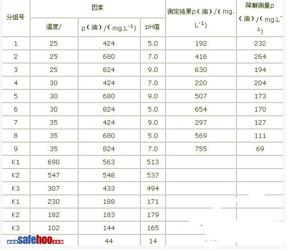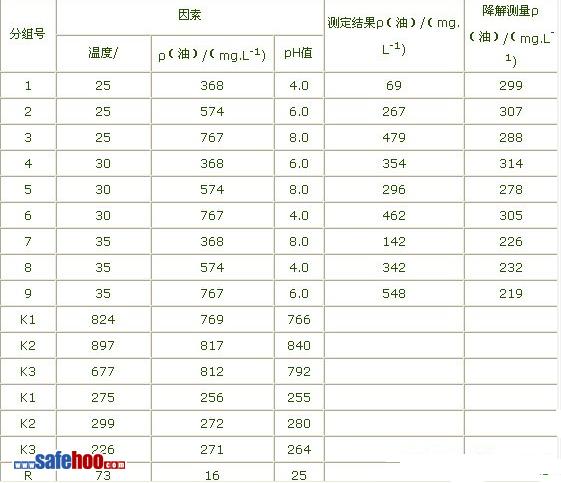 在保證供氧和氮、磷營養(yǎng)前提下,選擇溫度。油的質(zhì)量濃度(以mg/L計)和pH值作為本次實驗的三個因素進行三水平實驗,方案見表1、表2。將平板培養(yǎng)48h的菌體刮下,5000r/min離心5min,分離得到濕菌體。向方案中每個樣品加入0.5g濕菌體,培養(yǎng)60h后測定樣品中油的質(zhì)量濃度。