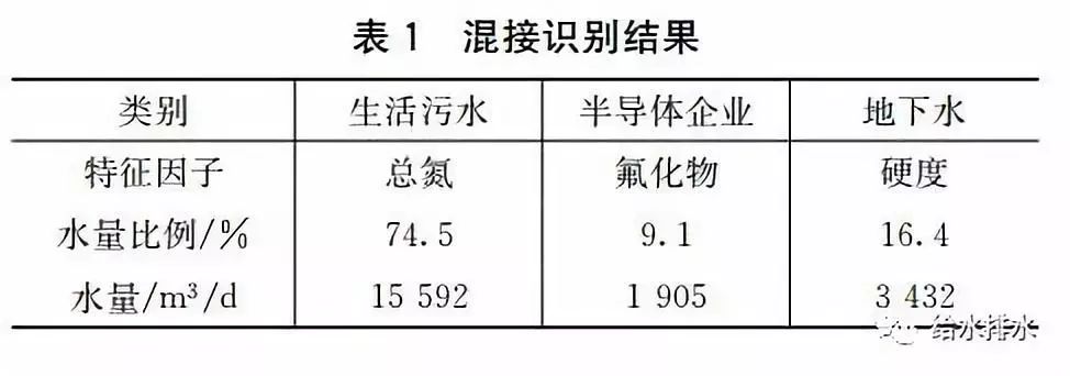 如圖3所示的研究區(qū)域,主要混接污染來源于生活污染和電子企業(yè),管網(wǎng)中的水量還包括地下水,根據(jù)特征因子的混接識(shí)別計(jì)算確定了混接污水量和地下水量。如表1所示,為混接改造提供了依據(jù)。