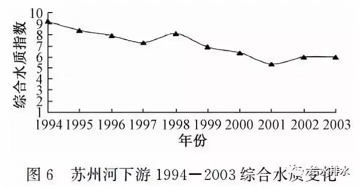 圖6表示了蘇州河下游1994年到2003年綜合水質(zhì)的變化,如果用單一指標(biāo),蘇州河水質(zhì)總磷一直劣于V類水,無法表達(dá)水質(zhì)的改善。圖7表達(dá)了黃浦江2003年上游到下游各斷面綜合水質(zhì)的變化,可以清晰界定區(qū)域責(zé)任,如果采用單一指標(biāo),很難對(duì)比。