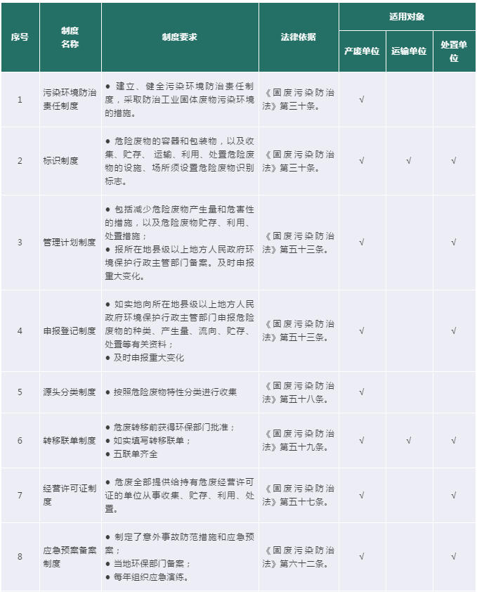 目前,國家對于“危廢”的管理主要集中在其產(chǎn)生、運輸及處置三個環(huán)節(jié)。涉及到的監(jiān)管對象分別為產(chǎn)廢單位、運輸單位和處置單位。相關(guān)的管理制度散見在《固廢污染防治法》、《危險廢物經(jīng)營許可證管理辦法》、《危險廢物轉(zhuǎn)移聯(lián)單管理辦法》、《危險廢物焚燒污染控制標(biāo)準(zhǔn)》(GB18484)等前述相關(guān)的國家政策、法律法規(guī)和標(biāo)準(zhǔn)中,內(nèi)容涉及危險廢物識別標(biāo)志的設(shè)置、危險廢物管理計劃的制定、危險廢物申報登記、轉(zhuǎn)移聯(lián)單、經(jīng)營許可、應(yīng)急預(yù)案備案以及貯存、利用、處置危險廢物中的具體要求,我們結(jié)合上述規(guī)定對相關(guān)制度進行了總結(jié)和歸納,以供涉及危廢管理的上下游企業(yè)參考。具體如下表所示:
