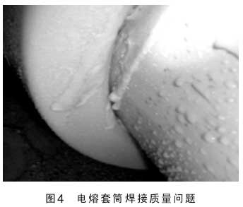 在燃?xì)夤艿朗┕み^(guò)程中,因施工單位人員、現(xiàn)場(chǎng)監(jiān)理人員以及建設(shè)單位現(xiàn)場(chǎng)管理人員對(duì)燃?xì)夤艿腊惭b施工質(zhì)量監(jiān)管不到位,施工經(jīng)驗(yàn)不足或者根本不懂燃?xì)夤艿朗┕さ闹匾?,不按照燃?xì)庑袠I(yè)國(guó)家規(guī)范和行業(yè)標(biāo)準(zhǔn)嚴(yán)格操作和監(jiān)管,產(chǎn)生一系列施工質(zhì)量隱患。如鋼管防腐處理不到位、閥井內(nèi)波紋補(bǔ)償器受外力安裝偏斜或不同軸,電熔管件焊接焊口冷卻采取沖水冷卻方式,PE管道運(yùn)輸、搬運(yùn)造成管壁劃傷嚴(yán)重超標(biāo)等人為因素,給城市燃?xì)夤艿腊踩\(yùn)行種下了一顆顆定時(shí)炸彈(如圖3、4、5)。