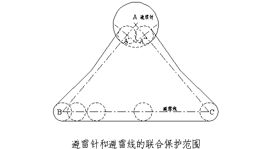 如果采用避雷針、避雷線聯(lián)合保護(hù),其范圍應(yīng)當(dāng)按圖2確定。將避雷線各點(diǎn)看作是等效避雷針,如等效避雷針B和C其等效高度避雷線該點(diǎn)高度的80%;然后在A與B ,A與C之間分別按兩支避雷針的方法確定其保護(hù)范圍。