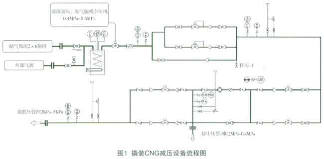 撬裝CNG減壓設(shè)備采用3N減壓形式,其中二級(jí)減壓后預(yù)留中壓出口1個(gè),出口壓力為0.2MPa~0.4MPa;三級(jí)減壓后預(yù)留低壓出口1個(gè),出口壓力為2kPa~5kPa。見圖1。