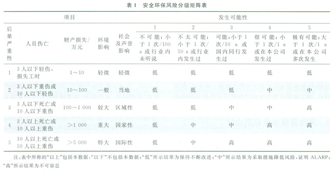 對識(shí)別出的危害因素應(yīng)進(jìn)行評(píng)價(jià)以確定其風(fēng)險(xiǎn)的高低,從而明確相應(yīng)的管理措施。國內(nèi)外對于安全環(huán)保風(fēng)險(xiǎn)的評(píng)價(jià)與分級(jí),均同時(shí)使用了定量、半定量、定性的方法和分級(jí)指標(biāo),所有方法的共同之處在于評(píng)估一個(gè)事件的概率及該事件可能產(chǎn)生的后果。