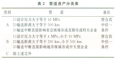 1)資產(chǎn)分類:可根據(jù)管道、站場和儲(chǔ)庫的基本屬性、規(guī)模和系統(tǒng)重要性等因素分成A、B、C類(表2)。