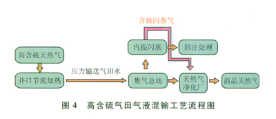 自主研發(fā)了以控制流態(tài)為核心的氣液混輸技術(shù),在國內(nèi)首次界定了輸送介質(zhì)的最大、最小流速,減緩了管內(nèi)液體沉積對管道的腐蝕,確保了緩蝕劑的應(yīng)用效果。首次在國內(nèi)高含硫氣田應(yīng)用氣液密閉混輸技術(shù),高含硫氣田水經(jīng)閃蒸脫氣后集中處理回注,含硫閃蒸氣集中進(jìn)入后續(xù)硫磺回收裝置,實現(xiàn)了氣田水和硫化氫全程零排放,每年回注氣田水400×104?m3。提出了高含硫氣田安全截斷、緊急放空和安全儀表系統(tǒng)控制設(shè)置原則,防止了意外工況下有毒氣體外泄。圖4為高含硫氣田氣液混輸工藝流程圖。