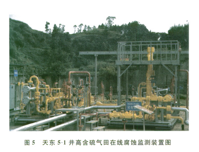 自主研發(fā)了國內(nèi)首個高含硫氣田在線腐蝕試驗裝置,形成了可變流速、氣液兩相高壓在線腐蝕監(jiān)測技術(shù),可在實際流態(tài)條件下對材料耐蝕性能進(jìn)行在線監(jiān)測,驗證材料和焊接工藝在現(xiàn)場應(yīng)用的可靠性。圖5為天東5-1井高含硫氣田在線腐蝕監(jiān)測裝置。