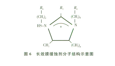 通過改進(jìn)緩蝕劑分子結(jié)構(gòu),引入巰基基團(tuán),增強(qiáng)了緩蝕劑的吸附成膜性能,與國外同類產(chǎn)品相比緩蝕劑的膜持久時間由10 d提高到45 d。應(yīng)用了清管器預(yù)膜技術(shù),解決了長距離管線緩蝕劑均勻保護(hù)和殘余藥劑回收的技術(shù)難題。首次在四川龍崗高含硫氣田進(jìn)行了全流程管線整體應(yīng)用清管器預(yù)膜技術(shù)。圖6為長效膜緩蝕劑分子結(jié)構(gòu)示意圖。