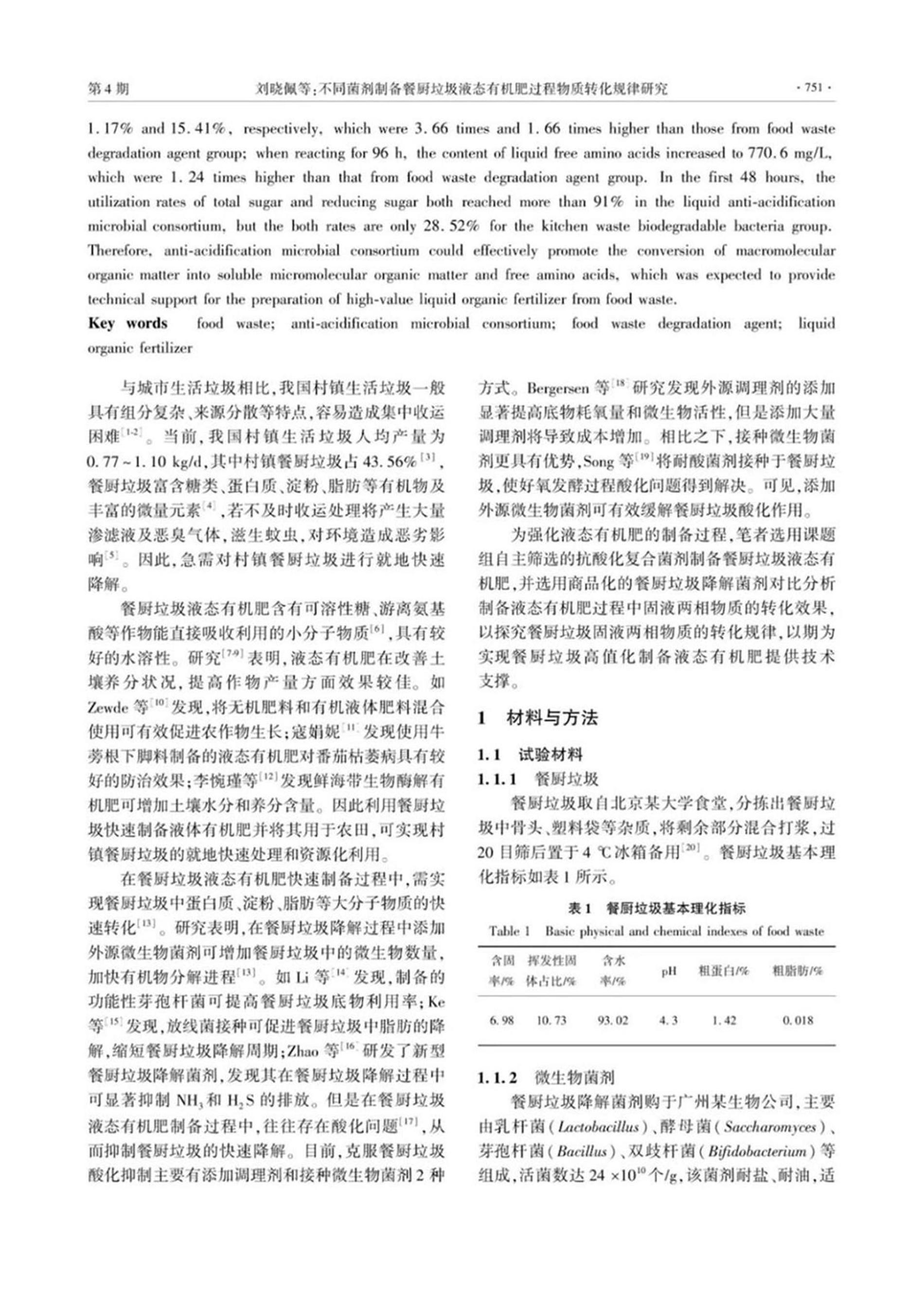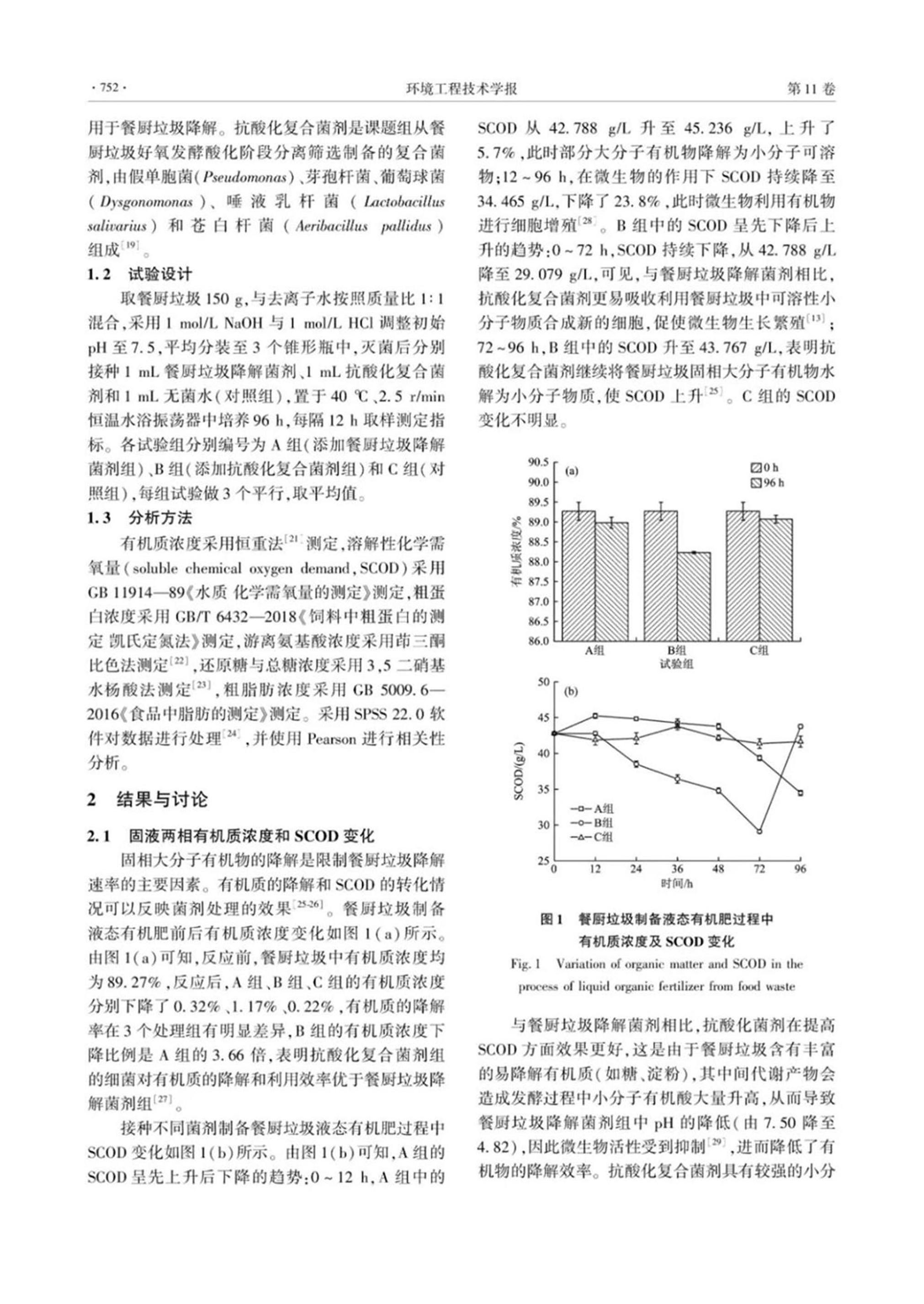 摘要:采用商品化的餐廚垃圾降解菌劑和自主篩選的抗酸化復(fù)合菌劑制備餐廚垃圾液態(tài)有機(jī)肥,對(duì)比分析不同菌劑對(duì)餐廚垃圾制備液態(tài)有機(jī)肥過程中固液兩相物質(zhì)轉(zhuǎn)化的影響,闡明餐廚垃圾制備液態(tài)有機(jī)肥過程中有機(jī)質(zhì)、糖類、粗蛋白等物質(zhì)的轉(zhuǎn)化規(guī)律。結(jié)果表明:2組菌劑均可降低餐廚垃圾中的有機(jī)質(zhì)和粗蛋白濃度,提高液相游離氨基酸濃度;其中接種抗酸化復(fù)合菌劑效果更佳,處理后餐廚垃圾固相有機(jī)質(zhì)、粗蛋白濃度下降比例分別為1.17%、15.41%,分別是餐廚垃圾降解菌劑組濃度下降比例的3.66和1.66倍;反應(yīng)96 h時(shí),液相游離氨基酸濃度達(dá)到770.6 mg/L,是餐廚垃圾降解菌劑組濃度的1.24倍;前48 h時(shí),抗酸化菌劑組液相中總糖和還原糖利用率均達(dá)到91%以上,而餐廚垃圾降解菌劑組均僅為28.52%??顾峄瘡?fù)合菌劑可有效促進(jìn)餐廚垃圾中大分子有機(jī)物轉(zhuǎn)化為可溶性小分子有機(jī)物以及游離氨基酸,有望為餐廚垃圾高值化液態(tài)有機(jī)肥的制備提供技術(shù)支撐。