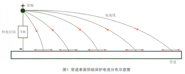 陰極保護(hù)系統(tǒng)電路路徑的構(gòu)成包括:土壤、管道、導(dǎo)線[2]。對(duì)于直流電路來說,根據(jù)歐姆定律可以知道,電路中的電流在流動(dòng)過程中,電流會(huì)始終傾向于在電阻較小的路徑流動(dòng)。當(dāng)管道的防腐層面電阻率變化不大、防腐層沒有出現(xiàn)嚴(yán)重的破損點(diǎn)和接地的情況時(shí),管道表面陰極保護(hù)電流的分布是相對(duì)較為均勻的,如圖1所示。