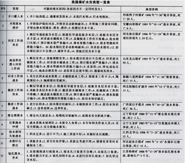 ??? 據(jù)中國煤礦事故集的統(tǒng)計,自1953年以來,我國煤礦發(fā)生水災事故的類型大體有12種:①井口灌人水;②井筒潰水潰沙;③回采工作面突水;④地表積水潰人回采工作面;⑤回采工作面透水;⑥掘進工作面突水;⑦掘進工作面透水;⑧煤倉潰煤水;⑨注漿跑水沖埋;⑩防水密閉失效透水;⑩水煤矸石潰出;⑩鉆孔潰水、突水。具體如下一覽表所示。