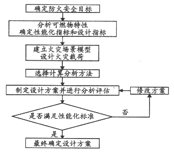 性能化防火設(shè)計方法的概念首先在建筑領(lǐng)域中提出。它的主要特點是在防火設(shè)計時僅提出消防安全所需要的性能要求或指標(biāo),而不明確規(guī)定設(shè)計人員采用某些特定的解決方法。如何達到這一指標(biāo)要求,采取什么樣的工程措施完全由設(shè)計人員確定,但是設(shè)計人員最終要向?qū)徍巳藛T證明其所選擇的解決方法是安全可靠的,所采用的設(shè)計計算方法是得到公認的,審核人員也要利用相應(yīng)的評估工具檢驗設(shè)計方案是否達到安全目標(biāo),其設(shè)計步驟如圖1所示。