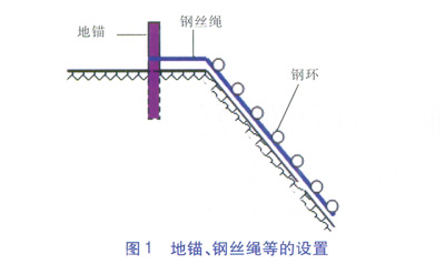 為了保障施工人員的人身安全,在坡頂平地上設(shè)置鋼管地錨(用于保證綁在施工人員身上的鋼絲繩固定牢固),地錨打入地下部分高度大于1.5m以確保安全,在地錨上固定兩根鋼絲繩,每根鋼絲繩上每隔1m設(shè)置一個鋼環(huán),在斜坡施工的人員必須佩戴安全帶,安全帶通過兩個條帶分別與兩根鋼絲繩連接。地錨、鋼絲繩等的設(shè)置見圖1。