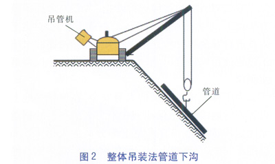 整體吊裝法指在斜坡所需要敷設(shè)的管道長度較小、管道總質(zhì)量滿足吊車安全操作的情況下,把兩根以上的管道組對焊接完成后一起吊裝下溝。在坡頂預(yù)制完成的管道下溝時,可以用吊車或吊管機(加長吊桿)直接吊放至溝內(nèi)。經(jīng)過現(xiàn)場多次實踐,該施工方法行之有效且安全性較好。但需要注意吊管機等起重設(shè)備在施工前必須進行性能檢查,對其安全性能進行測試,且其所在的地形坡度一般不能超過12°。整體吊裝法管道下溝見圖2。