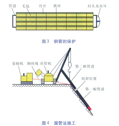 在進行鋼管下溝時,一般用柔性物(草袋、毛氈)將管道包裹,外表面用竹片保護,用鐵絲捆扎牢固,管端焊制封頭、吊耳[3](鋼管的保護見圖3)。將鋼絲繩拴在吊耳上,鋼絲繩另一端連接卷揚機。用吊車或吊管機(加長吊桿)直接將第一根管道吊放到管溝內(nèi),用卷揚機牽引著向山底(沖溝)下方移動,緩緩向下溜管,直到第一根管道尾端到達組焊預(yù)定位置(一般為斜坡頂部附近)停止溜管;然后用吊車或吊管機吊裝第二根管道,在組焊預(yù)定位置進行組對焊接作業(yè)。第一、二根鋼管組焊且焊縫冷卻后,在吊管機的配合下,卷揚機牽引著兩根管道緩緩向山坡(沖溝)下方移動,當(dāng)管道尾端到達組焊預(yù)定位置后,吊車或吊管機吊裝第三根管道,在組焊預(yù)定位置進行組對焊接作業(yè)。依此類推,直至達到要求的敷設(shè)管道長度。通過彎管連接坡頂管道和斜坡管道,坡頂管道敷設(shè)長度宜大于100m,確保斜坡管道在牽引鋼絲繩解開后的穩(wěn)定性。溜管法施工見圖4。