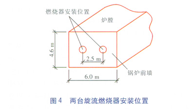 燃氣鍋爐結構參數(shù)為:爐膛長度(進深)為9.7m,爐膛寬度為6.0m,爐膛平均高度為4.62m。爐膛容積約為268m3,采用強制通風、微正壓燃燒。水處理采用爐外化學處理(鈉離子交換器),經取樣化驗,軟化水硬度(硬度以軟化水中鈣、鎂離子的總濃度衡量)0.8mmol/L,pH值為7.4,屬于正常范圍,符合GB?1576—2008《工業(yè)鍋爐水質》的要求。燃燒器為旋流式燃燒器(見圖3),兩臺旋流燃燒器安裝位置見圖4,旋流燃燒器安裝高度基本為爐膛中心高度。運行過程中振動情況良好,額定負荷下,每臺燃燒器耗氣量約6400m3/h。