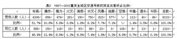 就目前我國(guó)城市緊急救助系統(tǒng)參與搶救的突發(fā)性事件來看,使交通緊急救援工作依托于城市緊急救助系統(tǒng)的資源和網(wǎng)絡(luò)也是合理的。以1987年至2002年重慶主城區(qū)發(fā)生的271起突發(fā)大型災(zāi)害事件為例[4](如表3所示)。