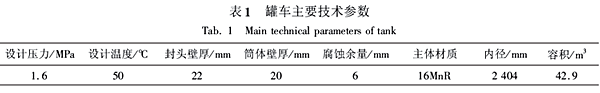 罐車簡況 該罐車由錦西化工機(jī)械廠設(shè)計并制造,1986年出廠,1987年投入運行。罐車自投用以來,已按規(guī)定分別作了11次中修檢驗和3次大修檢驗。在前14次檢驗中,罐體未發(fā)現(xiàn)重大缺陷,安全狀況等級1級。罐車原始技術(shù)資料、運行記錄及歷次檢驗、檢修報告齊全。罐車主要技術(shù)參數(shù)見表1。