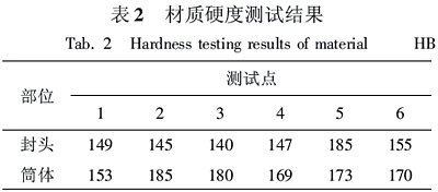 硬度測定 采用便攜式布氏硬度計,在封頭、筒體各取6點進(jìn)行硬度測試[2],測試結(jié)果見表2。