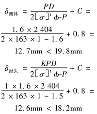 壁厚測定及強(qiáng)度校核 封頭實測最小壁厚為18.2mm,筒體實測最小壁厚為19.8mm。以實際使用時間15a計算,可知年腐蝕速率為0.12mm/a?! ∫詨毫θ萜鳜F(xiàn)行標(biāo)準(zhǔn)GB150-1998[1]進(jìn)行校核