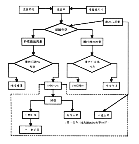 定量方法包括使用模型描述失效事件對(duì)人員、財(cái)產(chǎn)、生產(chǎn)運(yùn)行和環(huán)境的影響。定量失效模型中通常含有一個(gè)或多個(gè)標(biāo)準(zhǔn)的失效模式和結(jié)果。對(duì)于泄漏后的后果取決于泄漏流體的性質(zhì)和泄漏的能量。圖3為RBI失效后果的定量評(píng)估過程:
