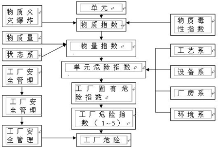 該評價方法是依化工生產(chǎn)、儲存過程中的物質(zhì)、物量指數(shù)為基礎(chǔ),用工藝、設(shè)備、廠房、安全裝置、環(huán)境、工廠安全管理等系統(tǒng)系數(shù)修正后,得出工廠的實際危險等級。